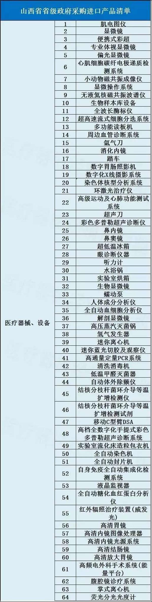 而在此之前,山西省政府采購網(wǎng)發(fā)布《山西省省級(jí)政府采購進(jìn)口產(chǎn)品清單》(簡稱《進(jìn)口產(chǎn)品清單》),其中67種醫(yī)用設(shè)備產(chǎn)品被納入允許采購進(jìn)口清單。