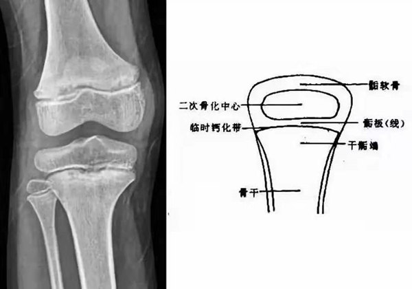 我們都知道,人體的高矮是由骨骼的生長發(fā)育決定的,特別是下肢長骨。長骨呈長管狀,在長骨的兩端有一種專管骨骼生長的骺軟骨,它與干骺端之間有一盤狀軟骨結構稱為骺板(線),在幼兒的X光片上表現(xiàn)為一條較寬的透光帶。 (見下圖)