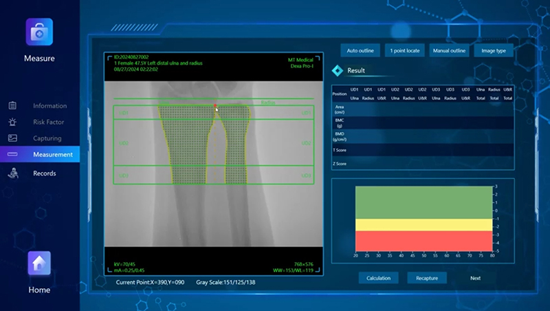 雙能X射線骨密度儀軟件:以雙能X射線骨密度儀DXA 800E為例,其軟件運用雙能X射線吸收測量法,設(shè)備發(fā)射出低能和高能兩種不同能量的X射線束,同時照射人體骨骼部位,通過測量不同能量X射線穿過骨骼后的衰減程度,計算機精確計算出骨骼的礦物質(zhì)含量,即骨密度。該軟件操作簡便快捷,整個檢查過程通常只需幾分鐘,能自動生成專業(yè)報告,大幅提升科室工作效率。