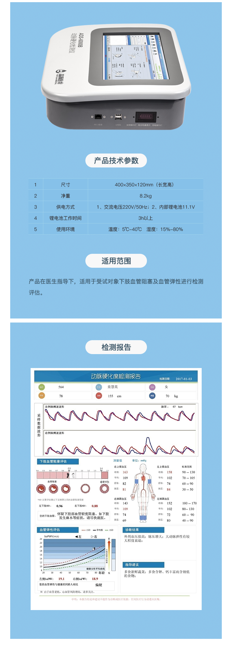 適用范圍:產(chǎn)品在醫(yī)生指導(dǎo)下,適用于受試對象下肢血管阻塞及血管彈性進(jìn)行檢測評估。